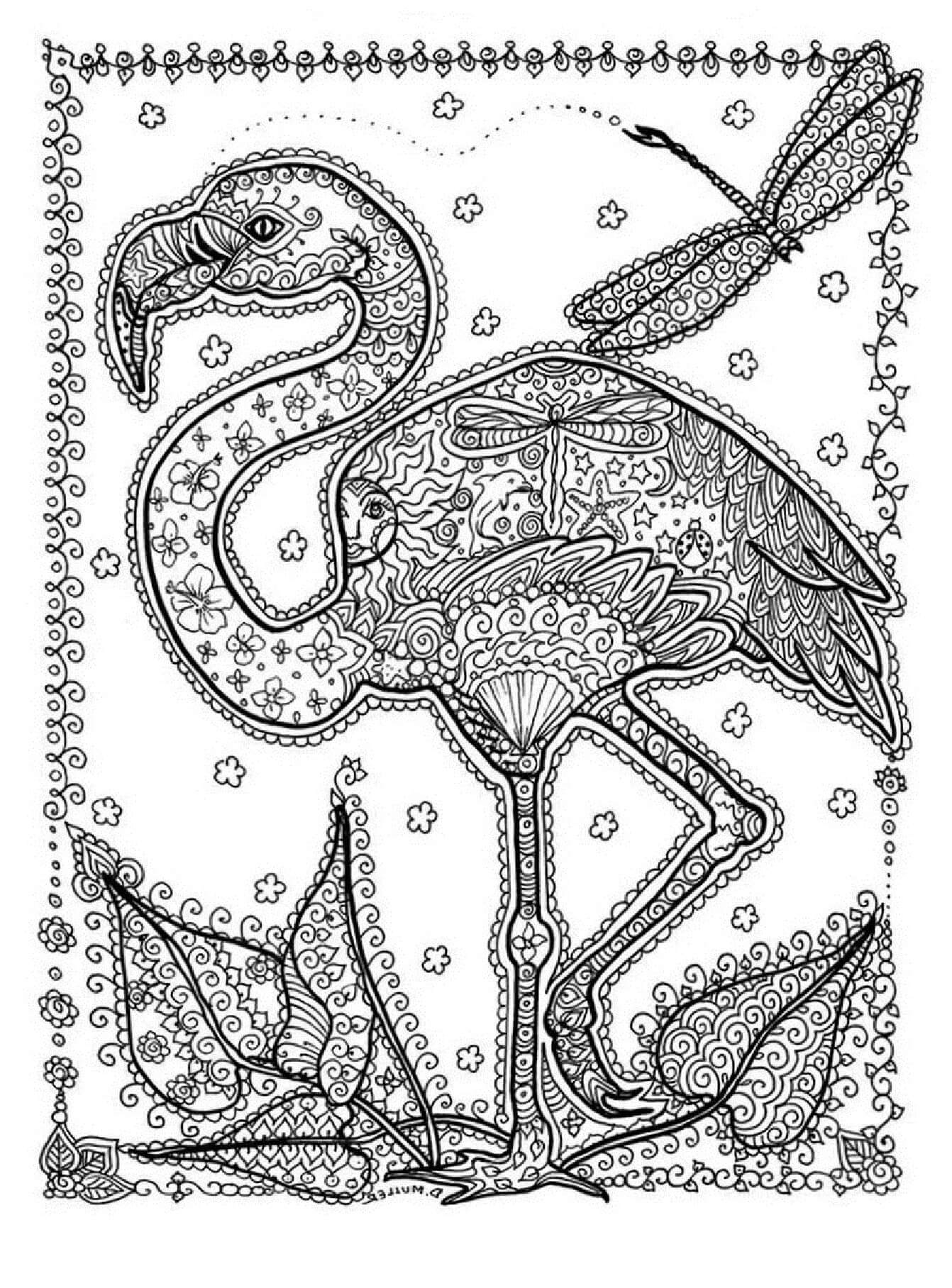 Madala Flamingo Flying With Leaves Coloring Page